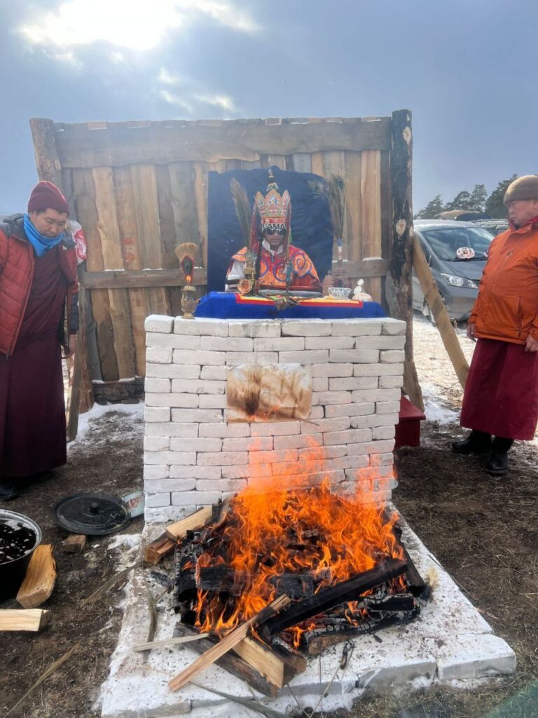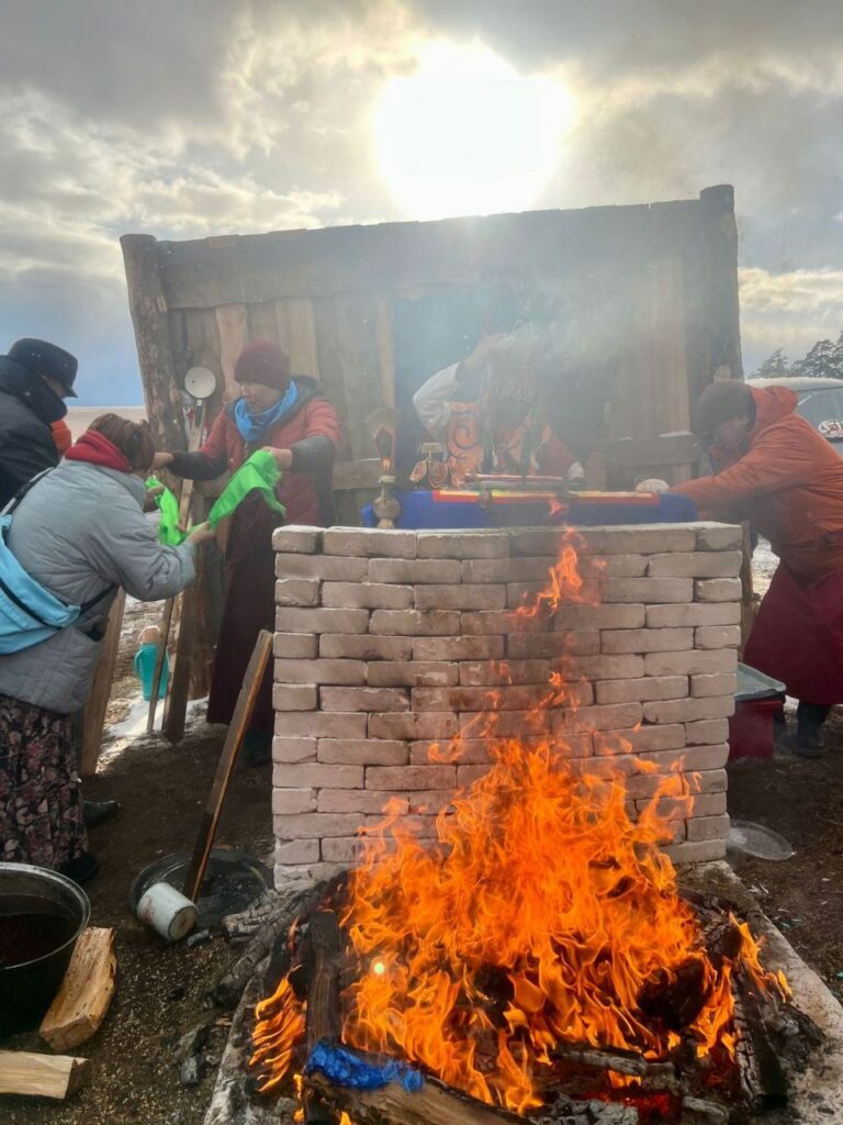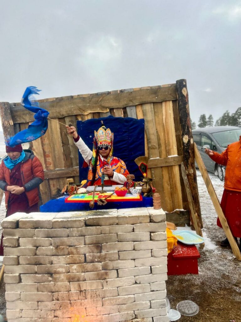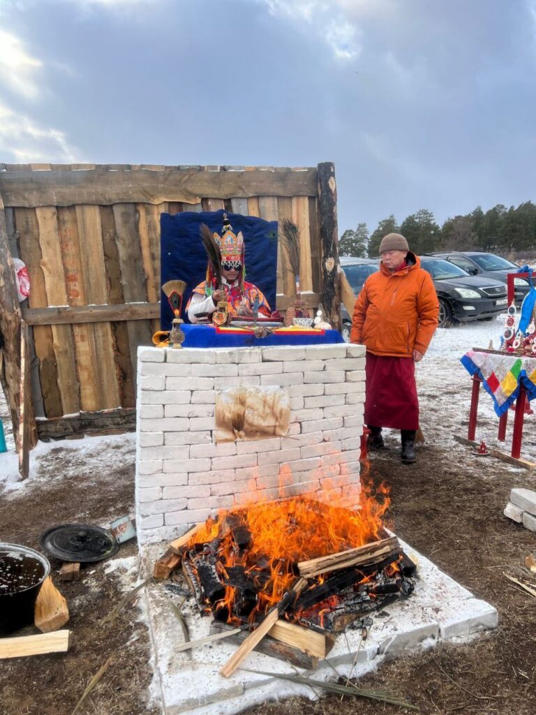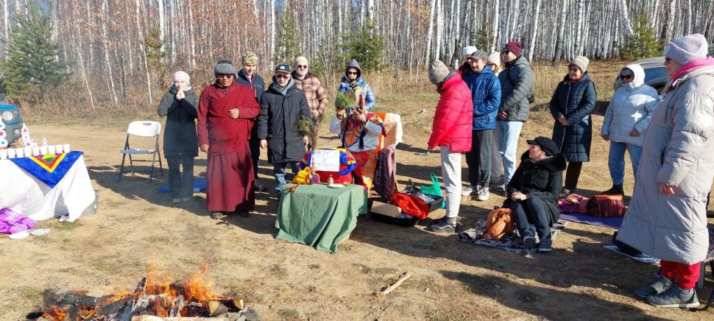 Next, Ga Lhakhang Rinpoche travelled to Buryatia, to the village of Mogsohon, where he granted various teachings and performed the Riwo Sangchö ritual and a Vajrakilaya Fire Puja. The weather was astonishing: gloomy dark clouds parted over the mountain slope and the bright sun appeared, illuminating the blue sky! In the evening, the local residents offered the Teacher a small concert performance at the Culture House and took a commemorative photograph.