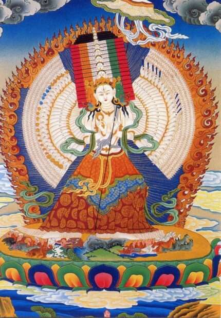 Sitatapatra (Sanskrit: Sitātapatrā, “White Umbrella”) is a powerful goddess in the Buddhist pantheon of Vajrayāna. She is the wrathful female aspect of the Buddha of Compassion, Avalokiteśvara, manifested from the ushnisha (crown protuberance) of Buddha Śākyamuni as a symbol of supreme accomplishment and protection of the Dharma. She is also one of the main emanations of White Tārā – the 19th of the 21 Tārās, known as the Invincible and Triumphant Tārā.